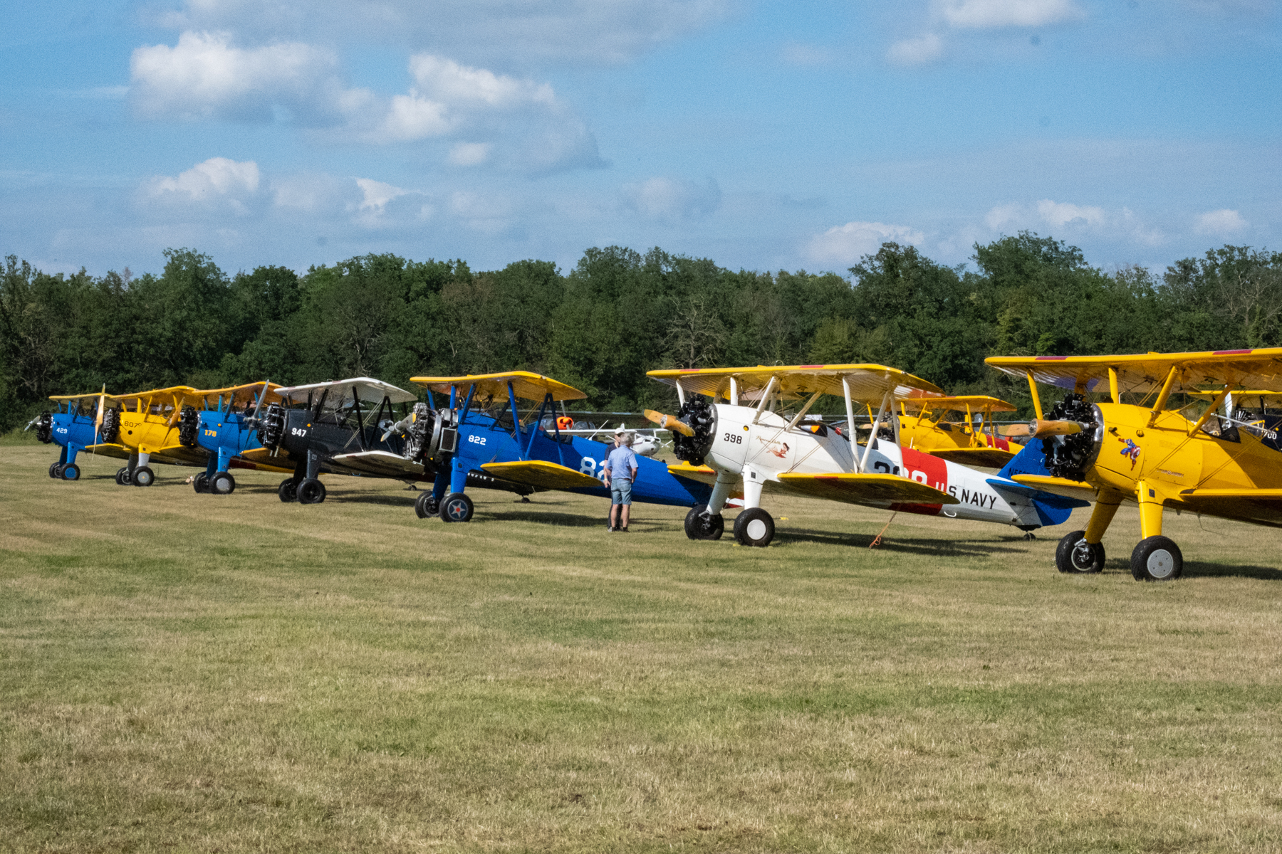 Und tatsächlich, das Wetter wurde besser, vor Ort wurden wir wieder von strahlendem Sonnenschein begrüßt! In der Platzrunde herrschte reger Betrieb, um die 200 Flugzeuge waren angemeldet, davon über 20 Boeing Stearman, und die schwebten nun alle nach und nach ein ! Was ein Spektakel ! Die Einweiser hatten alle Hände voll zu tun, jedem Neuankömmling den zugedachten Parkplatz zu zeigen.