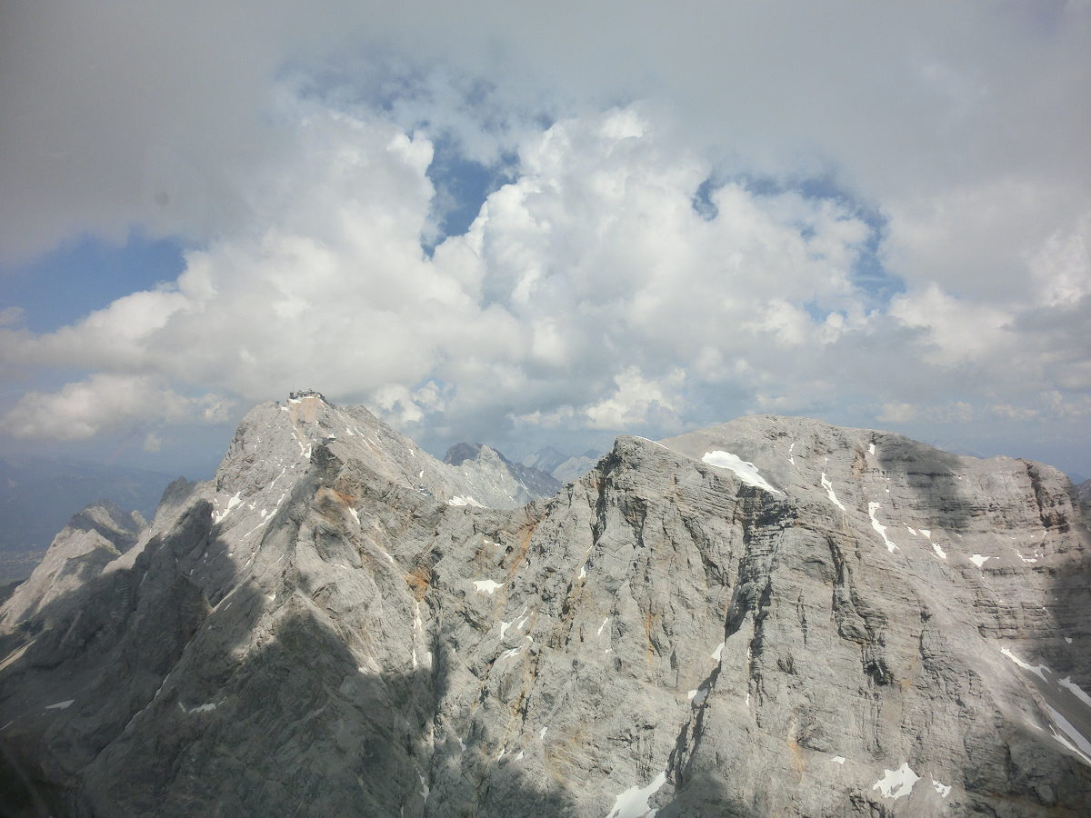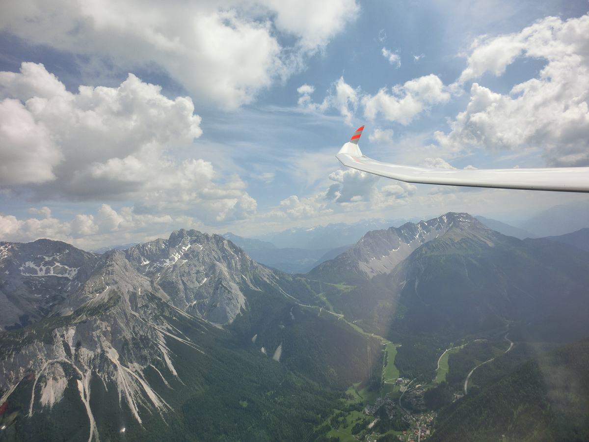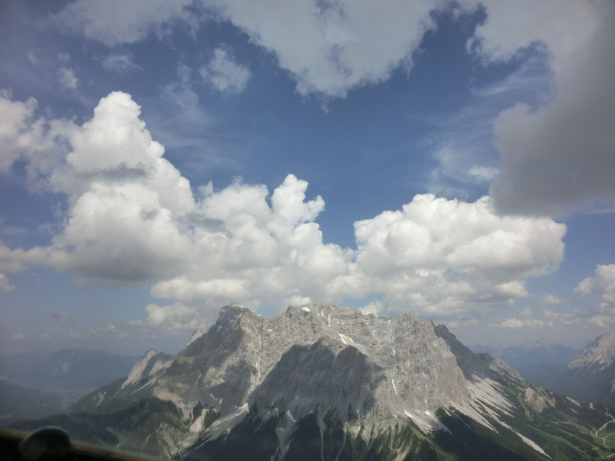 Doch nach diesem Flug war ich dann soweit, ich hatte mich langsam mit den Bergen angefreundet und dieses Mal ging es dann in den Süden, bis kurz vor Italien. Das war mein schönster, höchster und bis zu diesem Tag auch mein längster Flug! Von Reutte aus ging es südlich das Lechtal hinunter, dann über ein paar Berge ins Inntal, und danach zu den Gletschern an der Wildspitze. Da hatten wir eine Höhe von 3700m, hoch genug, um Sauerstoff aus der Flasche schnüffeln zu müssen. Die Kirsche auf der Torte war dann noch ein Besuch bei der Zugspitze – Deutschlands höchster Berg mal aus einer anderen Perspektive! So sind wir fast vier Stunden durch die Alpen geflogen, hatten oft ein Steigen von 3-5m/s, was man so von der Alb nicht gewohnt ist, allerdings auch ein dementsprechend großes Sinken, und Turbulenzen durch die starken Auf- und Abwinde.