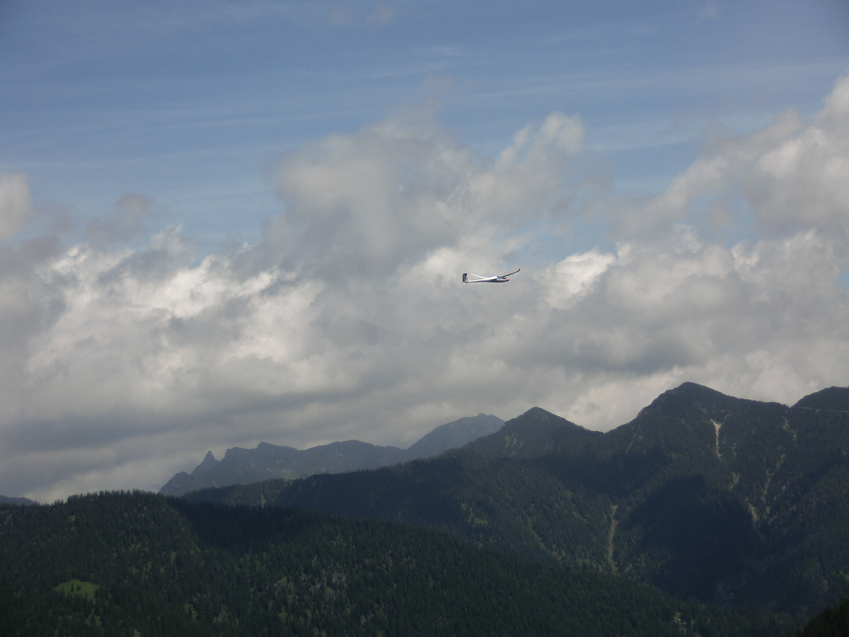 Bei unserem nächsten Flug sah das Ganze dann schon anders aus! Die Thermik war da, und wir haben es bis auf über 2000m geschafft, womit wir höher als die Berge direkt um Reutte waren. So konnten wir die Gräte entlang fliegen und um die Gipfelkreuze kreisen und den Wanderern winken. Da freuen die sich immer so süß und winken zurück. Doch bei der Sicht auf die Berge war mir immer noch nicht so wohl, so kam es, dass wir doch etwas zurück an die nördlichsten und tiefsten Bergen geflogen sind, und nicht weiter in den Süden, wo die Berge höher werden. Aber ich fand es einfach beruhigend, wenn die Berge oben drauf noch Bäume und Gras hatten und man nicht direkt an der nackten steilen Felswand entlang flog.