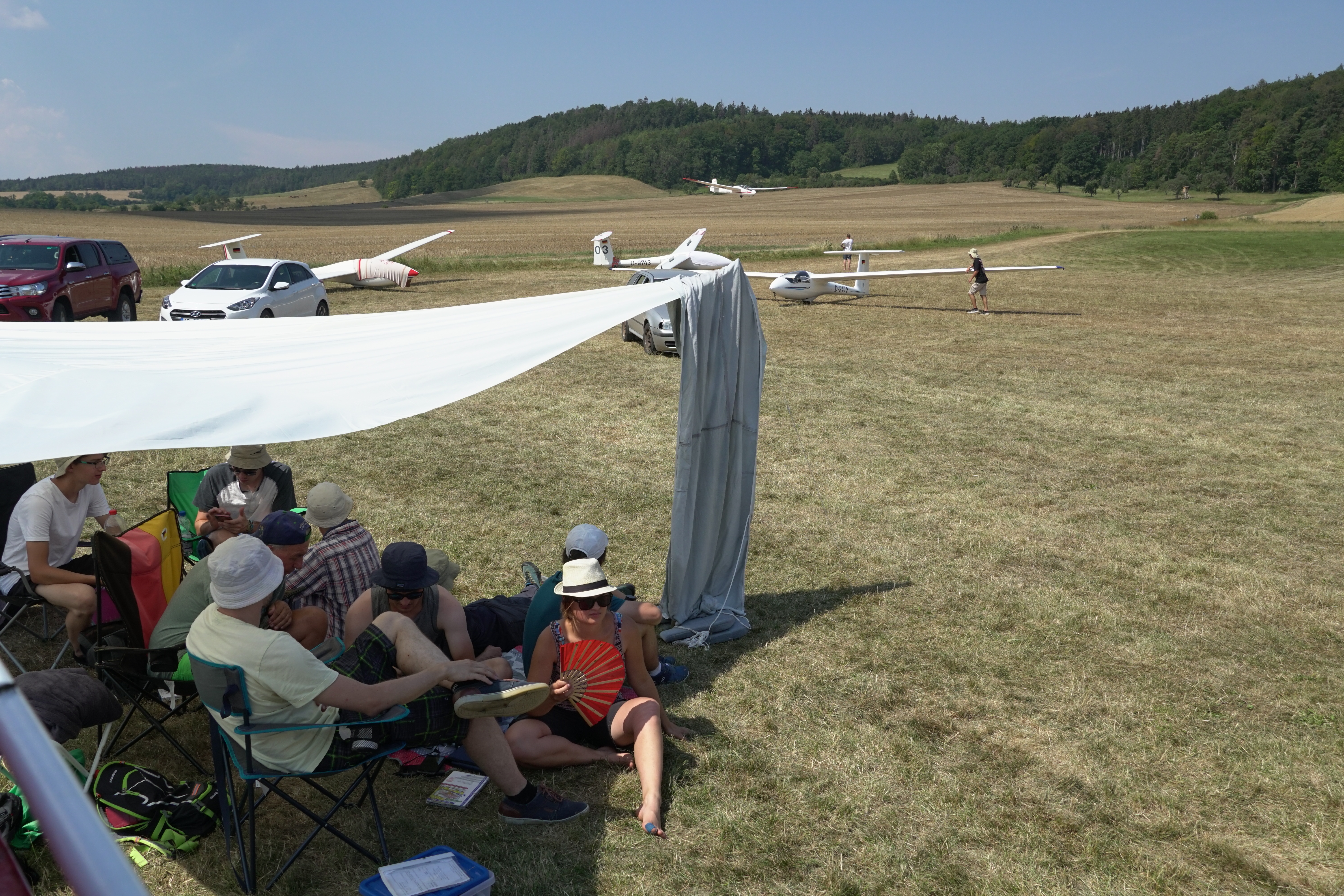 Trotz einiger Einschränkungen begann sich schnell Urlaubsstimmung breitzumachen. Wir konnten trotz des furchtbar heißen Wetters einige sehr schöne Flüge erleben. Wenn man sich dann doch einmal vor der Hitze im Cockpit abkühlen wollte gab es zur Erfrischung einen Badesee in der Nähe.